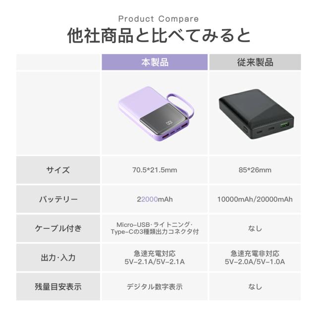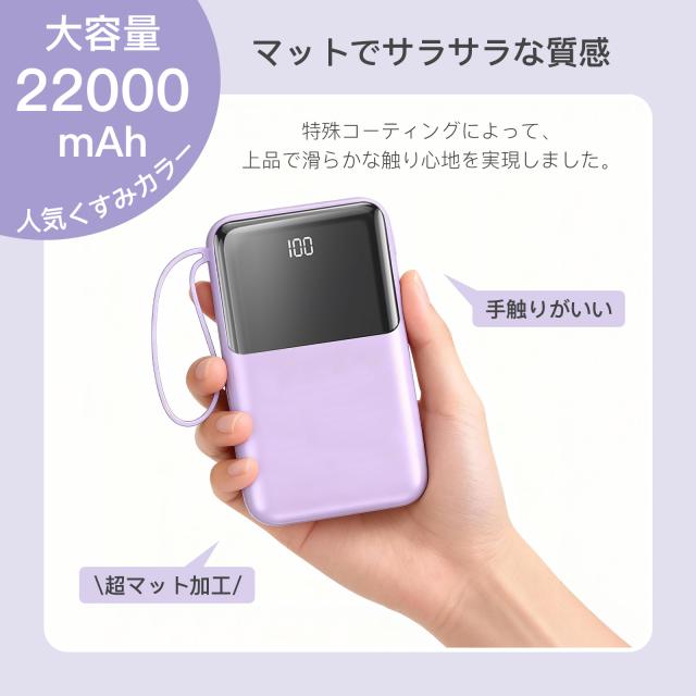 - 購入日の翌日に届き大満足です!安価で機能性もしっかりしてます。22000mAhの大容量でコロンとしたなコンパクトなデザインなのが最高です。コンパクトに持ち運びやすいと思います。普段はもちろん、旅行やお...