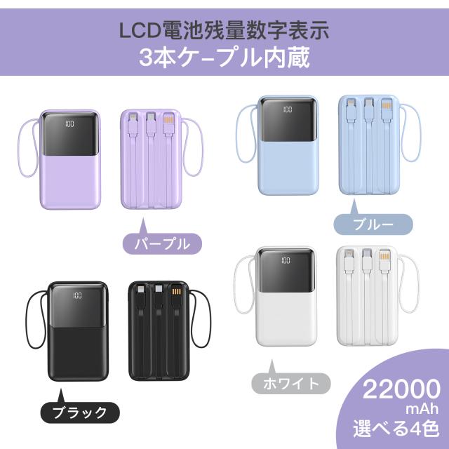 モバイルバッテリー 22000mAh ケーブル付き コンパクト 軽量設計 薄型 軽量 4台同時充電 LED残量表示 機内持ち込 同時みOK PSE認証済み