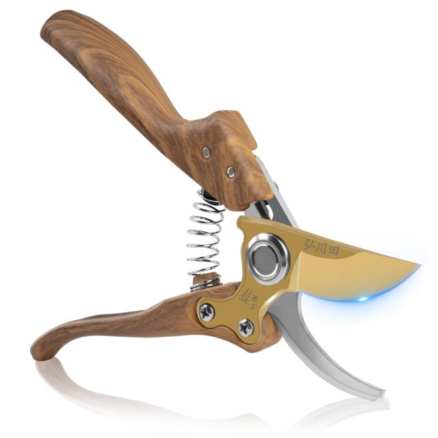 2. 人間工学に基づいた木製デザインハンドル この剪定ばさみは、持ちやすさと作業の快適さを追求して、人間工学に基づいたハンドルを採用しています。手にフィットし、長時間の使用でも疲れにくいデザインです。自然素材の木製ハンドルは、美しい外観と温かみのある手触りを提供します。切れ味が良い剪定ばさみを使うと、作業効率が飛躍的に向上します。鋭い刃は少ない力でスム ーズに切断できるため、手や腕への負担が軽減され、長時間の作業でも疲れにくくなります。(注意:ハンドルは木製デザインですが、実の木ではありません。)