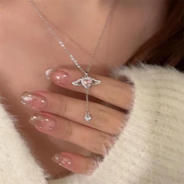 女性のための天使の翼が付いたペンダント付きネックレス,シンプルなペンダント,ピンク,白,ジルコン,エレガント,2023