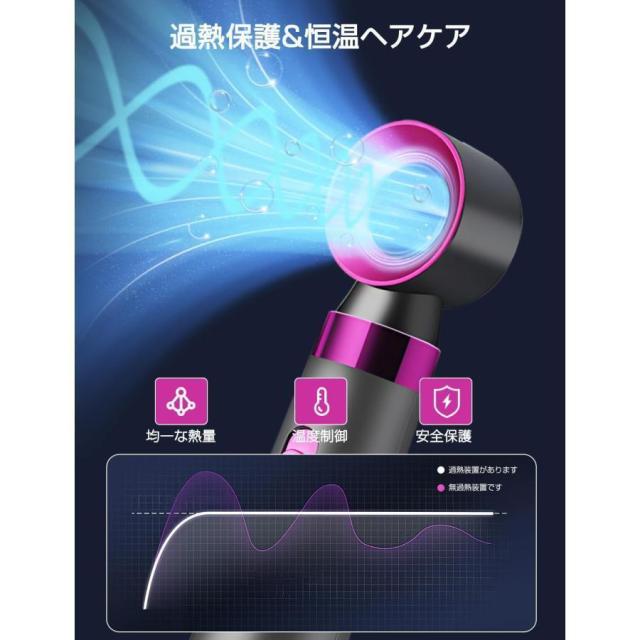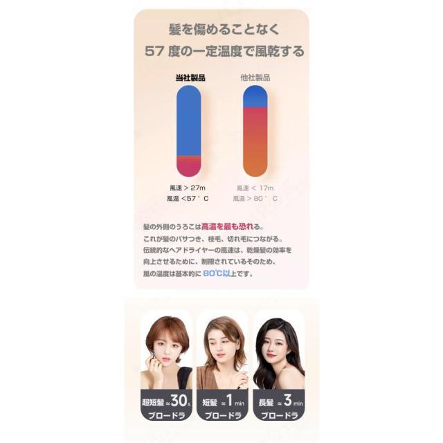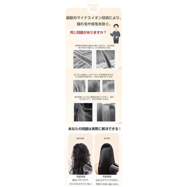 このヘアドライヤーは、高濃度のマイナスイオン装置を内蔵して、髪から根元まで静電気を保護するためにマイナスイオンを大量に放出することができます。4大スマート保護システムを持っています:スマート温度制御システム(58回/秒リアルタイムで正確に温度を制御して過熱損傷を防止します)、過熱断電保護チップ(設備温度が高すぎて、直ちに電力供給を停止します)、電磁放射を下げます(放射線の危害を遠ざけます)、精選純銅線コア(安全が保障されています)