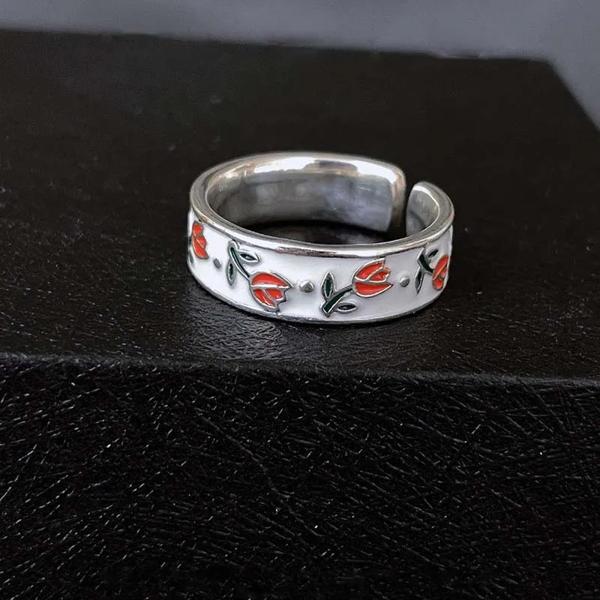 女性のためのヴィンテージエナメルチューリップリング,シンプルなシルバーカラー,調節可能なオープニング,パーティージュエリー