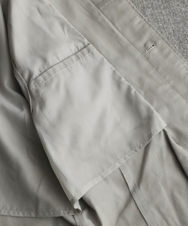 羽織るだけでサマになる、スタイリングしやすいデザイン性も魅力です。洗練された印象を与える比翼仕立てには、ボタンも目立たないように表地と同色のものを採用。袖口はボタンやストラップを付けずにスッキリとした袖のデザインに仕上げることで、様々なスタイルに馴染みやすくなっています。後ろには歩きやすいように深めのベントを入れました。歩く度になびく裾が美しく、わずかに裾広がりになったシルエットが軽快な印象を与えます。足さばきのことまで考えられたこだわりの一着です。