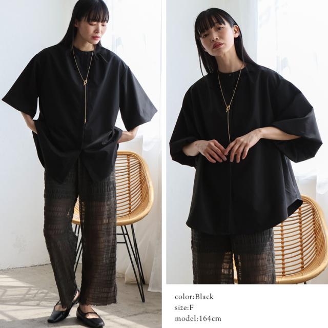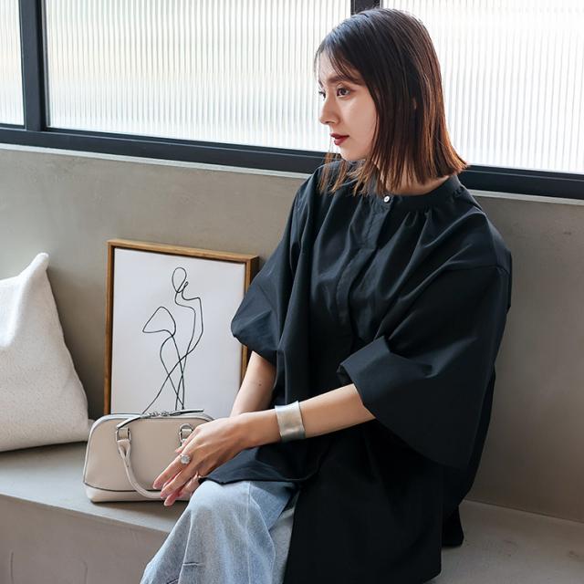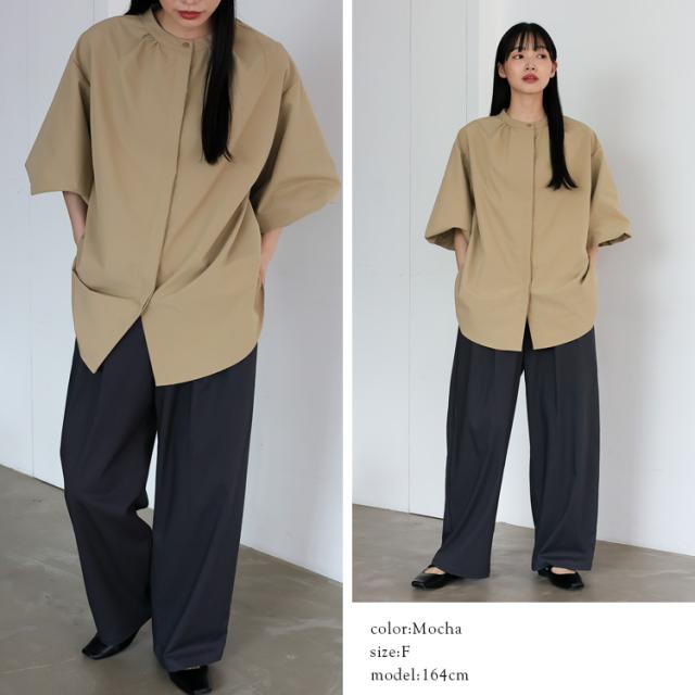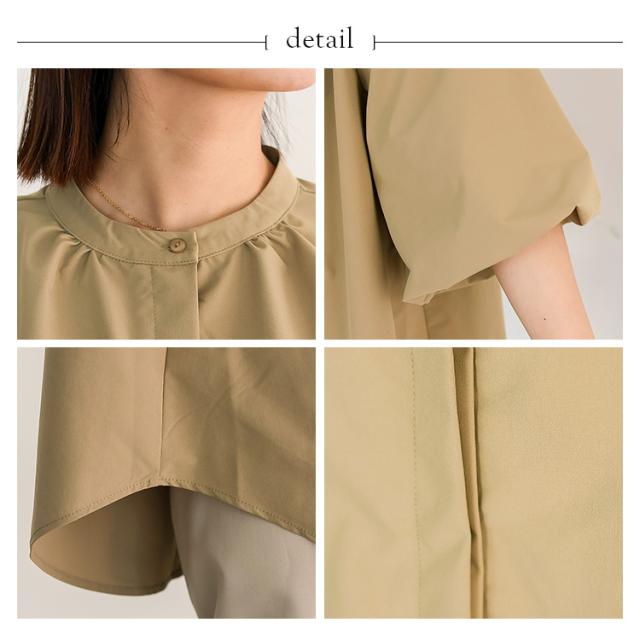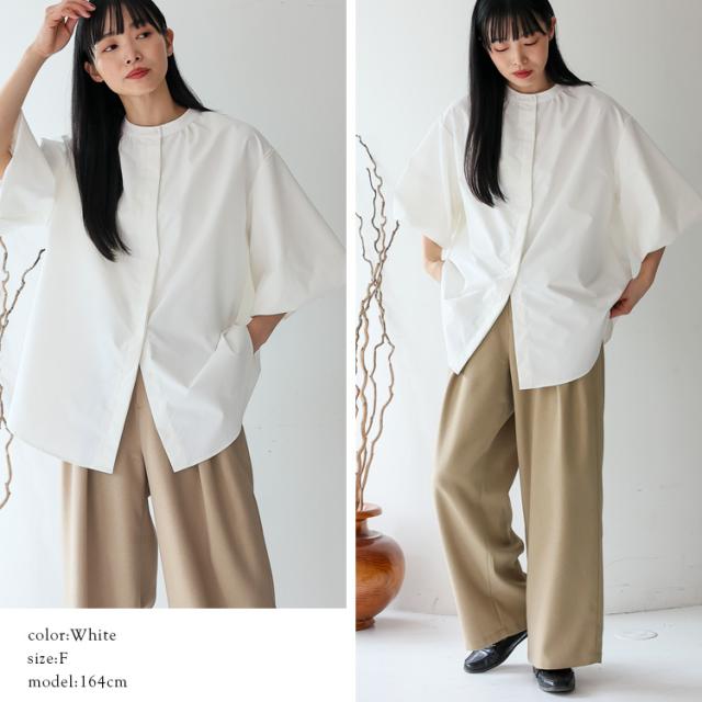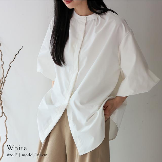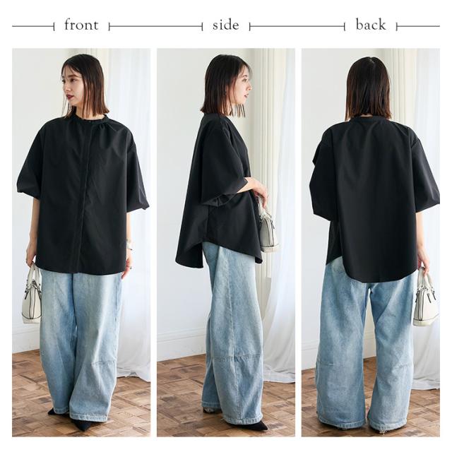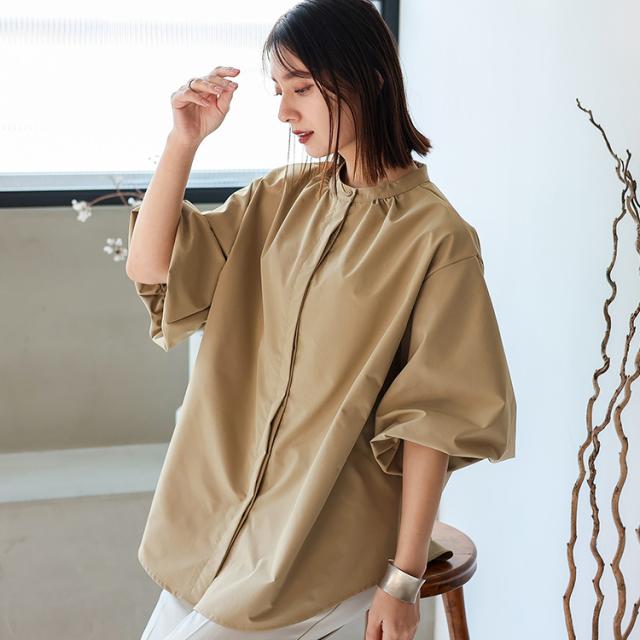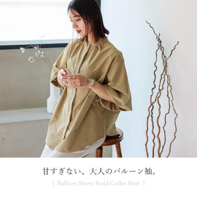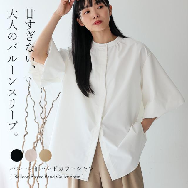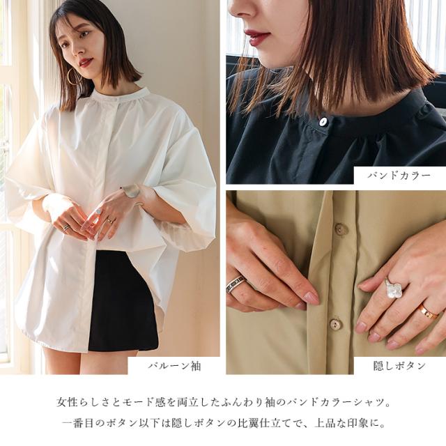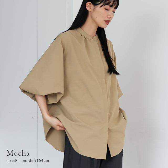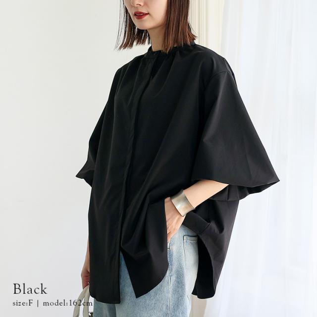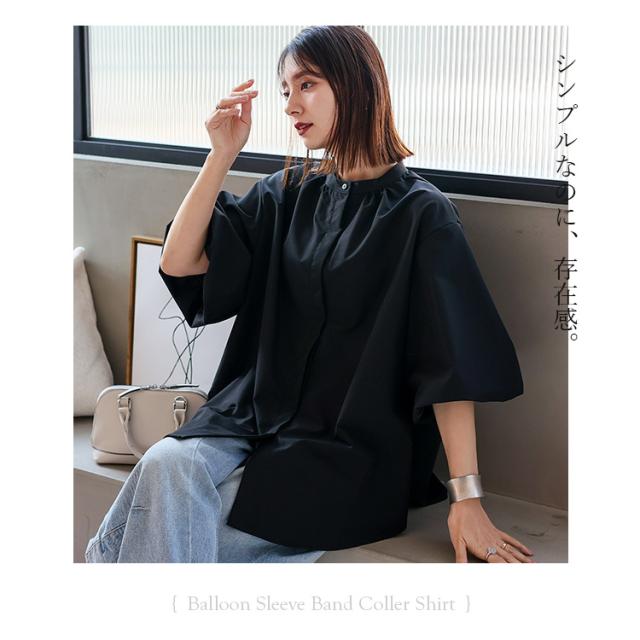 バルーン袖 ブラウス 半袖 スタンドカラー シャツ レディース バンドカラー シャツブラウス ボリューム袖 五分袖 トップス 春 夏 フォーマル セレモニー ぼわん袖 オーバーサイズ ゆったり きれいめ おしゃれ 体型カバー 無地 vkkc-0522【メール便】【No Rule No Line】