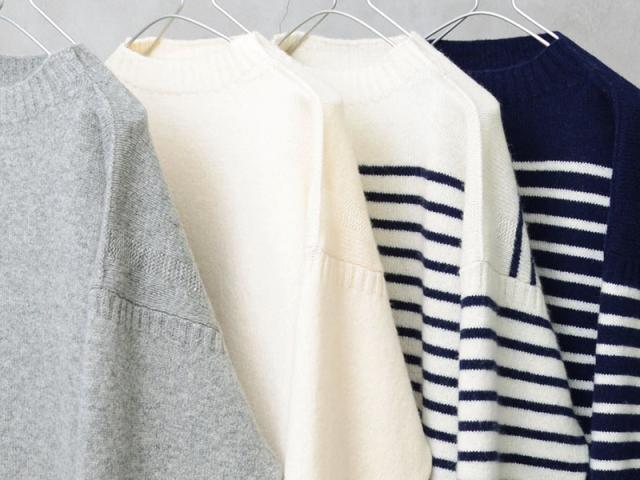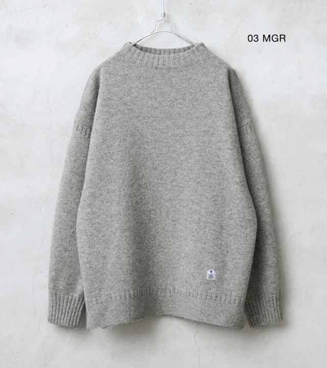 FIDELITYより、着心地よい伸縮性のあるガンジーニットが入荷しました。ガンジーニットといわれる、かつてイギリスのガンジー島の漁師たちが海へ出るときに着用していたもので、また仕事着だけでなく礼拝に行くときなどにも着用され、正装の場でも活躍したニットです。ニット本体部分はフライス編みを採用。横方向への伸縮性に優れており、ゆったりしたサイズ感で程よくリラックスフィットで着用可能です。 襟元と袖口はリブ編みなのでスッキリとした印象。 脇周りの編み模様や裾のサイドスリットなどフィッシャーマンニットならではのデザインは遊び心もありながらも上品なコーディネートが楽しめます。