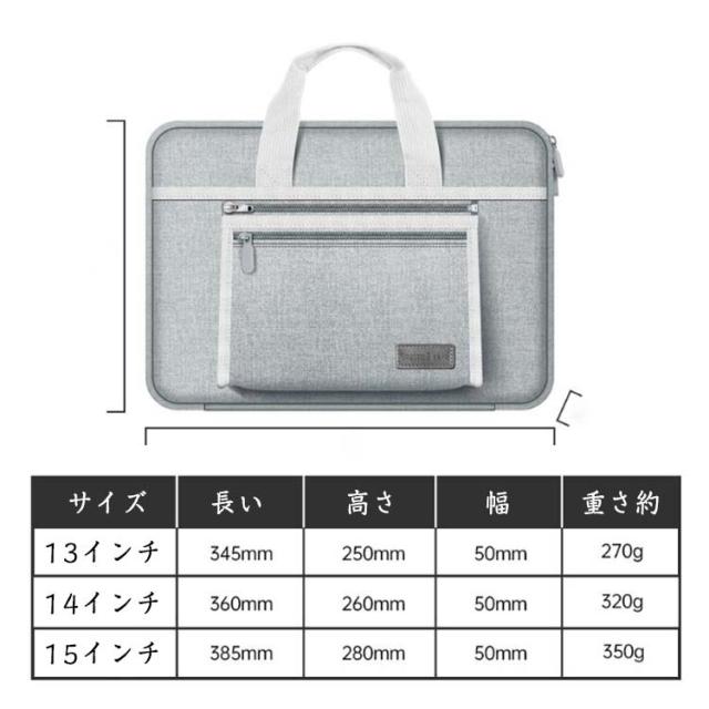 | サイズについての説明 | 13インチ:345*250*50mm/重さ約270g 14インチ:360*260*50mm/重さ約320g 15インチ:385*280*50mm/重さ約350g ※サイズ表の実寸法は商品によって1-2cm程度の誤差がある場合がございます。 |