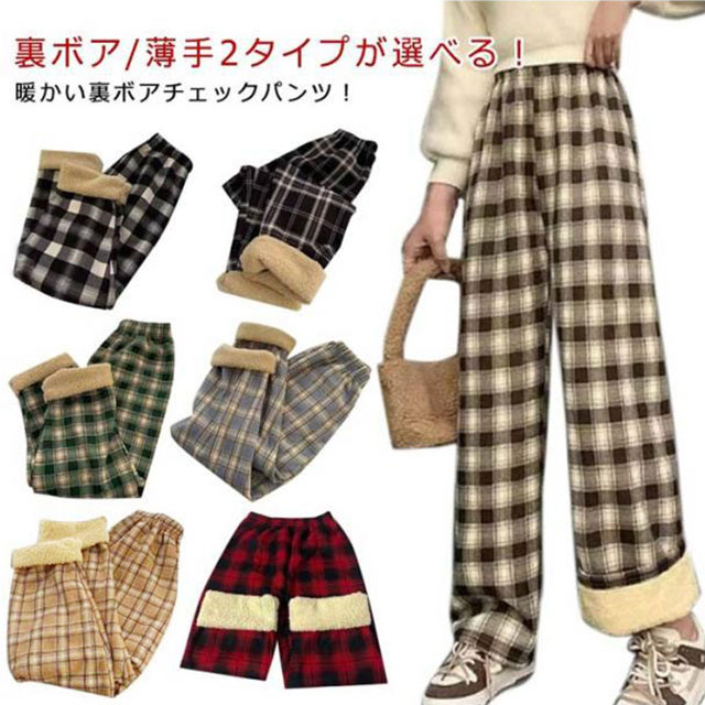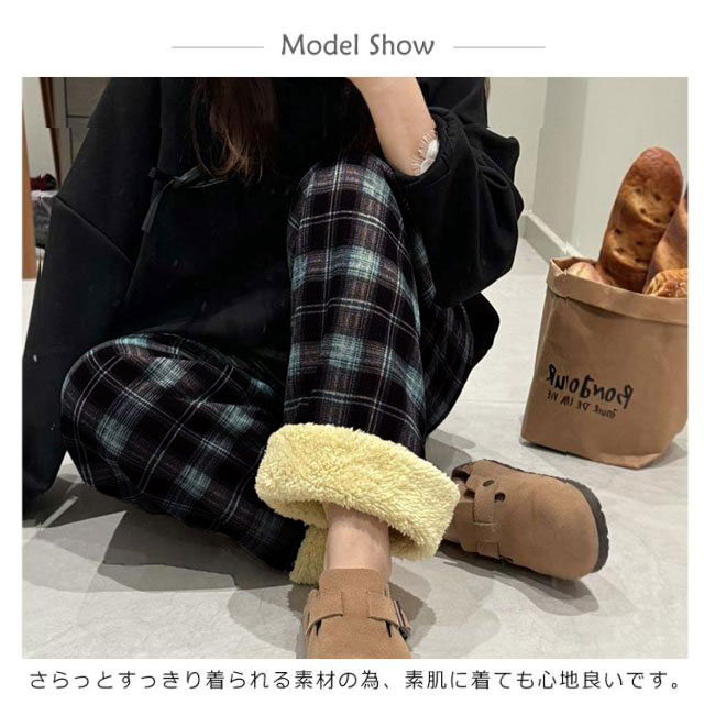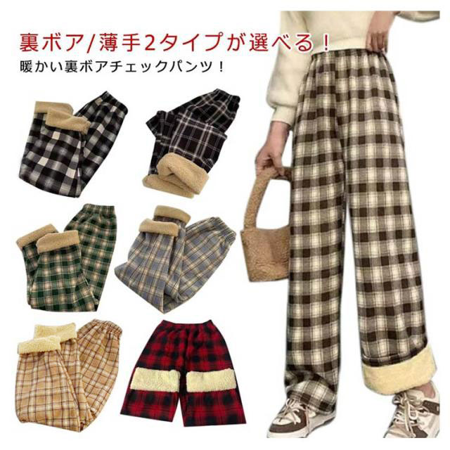 | 裏ボア/薄手2タイプが選べる!暖かい裏ボアチェックパンツ! さらっとすっきり着られる素材の為、素肌に着ても心地良いです。 パンツは、着脱便利なウエストゴム仕様。ストレスフリーな着心地を実現。 普段使いはもちろん、上品な見た目なので、家の近所のスーパーやコンビニに出かけることもできます。 | |