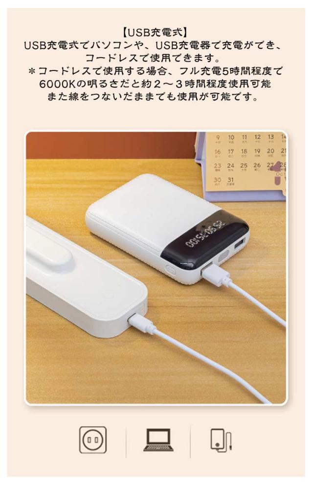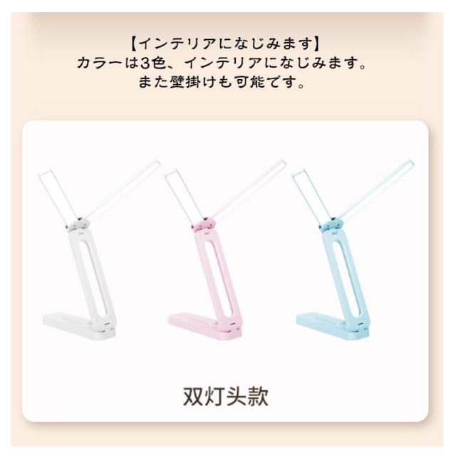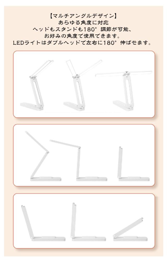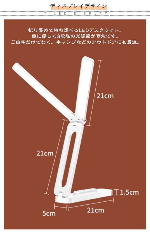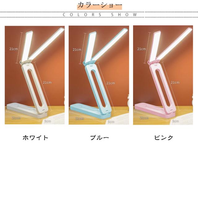 | USB充電式 4000mah 明るさ3段階調整 180°調節可能 折り畳めて持ち運べるLEDデスクライト 折り畳めて持ち運べるLEDデスクライト。 目に優しく3段階の光調節が可能です。 ご自宅だけでなく、キャンプなどのアウトドアにも最適。 【ダブルヘッドのワイド照射】 T型ワイド光源が広範囲を照らします。 影ができにくく、手元が見やすいので、学習や読書に最適です。 【目に優しいLEDライト】 LEDライトだから目に優しく疲れません。 タッチセンサーで3段階に光の調節が可能、さらに長押しするとお好きな明るさに調節できます。 ●6000K白色光 文字を書く時などに 適しています ●4000K自然光 読書や勉強に 適しています ●3000K暖かい光 レジャー・遊びなどに 適しています 【マルチアングルデザイン】 あらゆる角度に対応 ヘッドもスタンドも180°調節が可能、お好みの角度で使用できます。 LEDライトはダブルヘッドで左右に180°伸ばせます。 【40.5cm大面積立体照明】 ダブルライトで光量2倍、 快適2倍! 【USB充電式】 USB充電式でパソコンや、USB充電器で充電ができ、コードレスで使用できます。 *コードレスで使用する場合、フル充電5時間程度で6000Kの明るさだと約2〜3時間程度使用可能 また線をつないだままでも使用が可能です。 【インテリアになじみます】 カラーは3色、インテリアになじみます。 また壁掛けも可能です。 | |