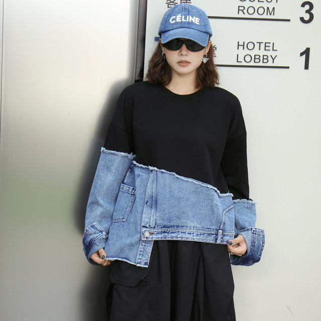 トレーナー レディース スウェット デニム 切り替え トップス pLegLad店 シャツ 個性的 長袖 モード系 ゆったり ルーズ 大人 きれいめ 白 黒 春秋