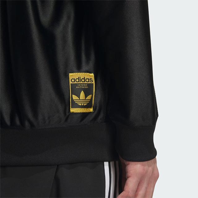 光沢感のあるブラックボディーをベースにメタリックカラーのスリーストライプス、ゴールドのトレフォイルロゴ刺繍をあしらった特別なアイテム。