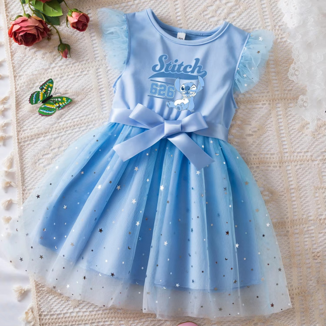 女の子 半袖 ワンピース 子供服 スティッチ ディズニー 女の子 プリンセスドレス 100cm-130cm ピンク ブルー ダークパープル3色 かわいい パーティー プリンセスファッション キューティー 春 夏 秋