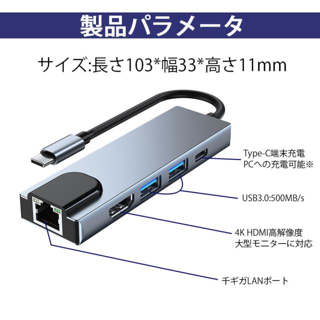 ドッキングステーション USBハブ 5in1 PD急速充電 有線LANポート イーサネット 千ギガポート USB3.0 変換アダプ