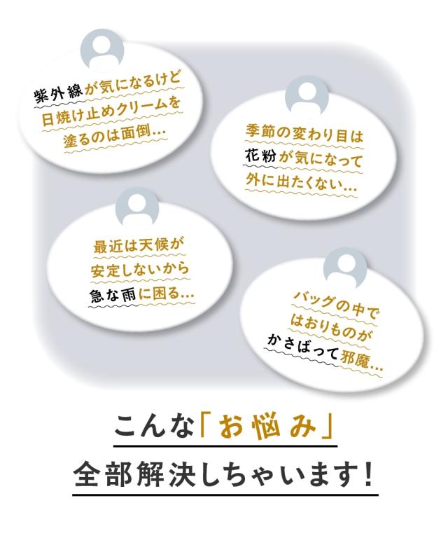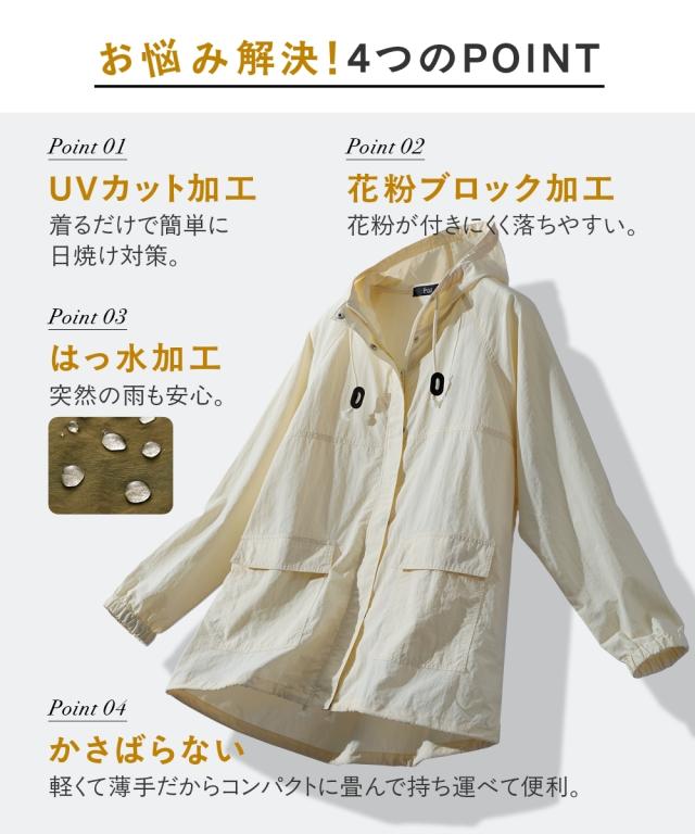 花粉が落ちやすい加工をしているので家に持ち込む量を抑えやすいです。裏地もなく厚すぎないナイロン素材なので年中使えます。また軽くて折りたたんでもコンパクトになるので持ち運びにも便利。紫外線も防いでくれて軽い雨や水滴をはじいてくれるので安心です。