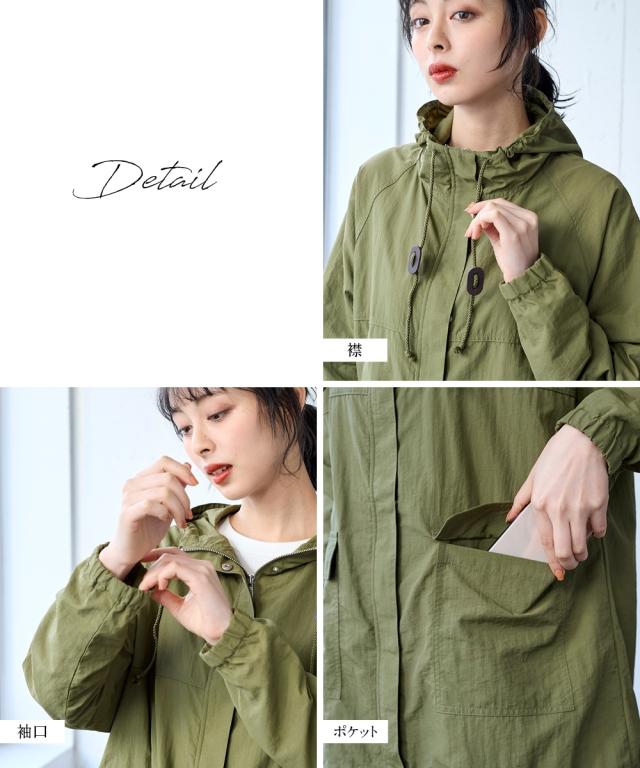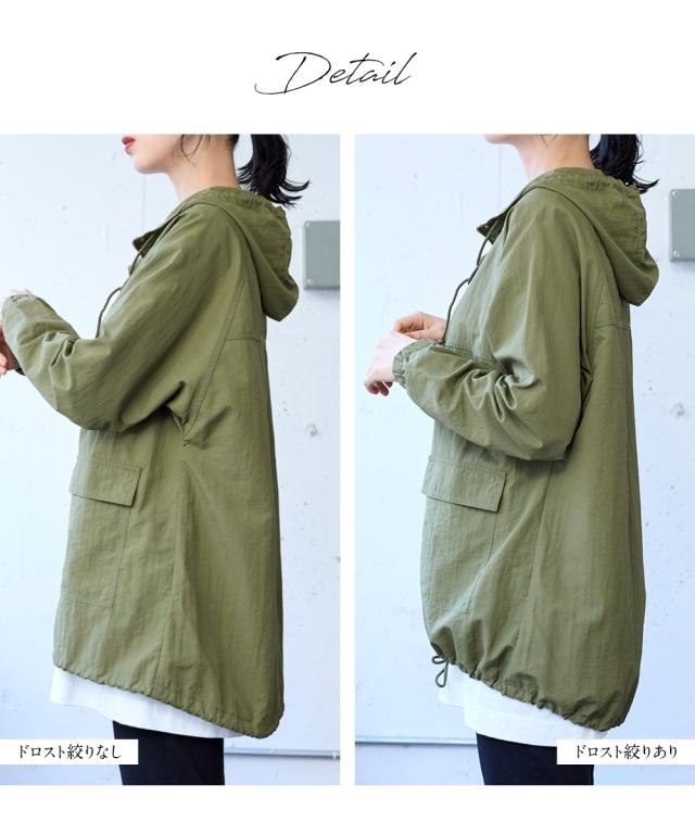 ゆったりしたサイズ設計になっているのでどんなアイテムと着てもラクチンです。裾にドロストが入っているのでシルエットが調整できて便利。後ろが長くなっているので気になり腰回りをしっかりカバーしてくれます。首のひもを絞れば気になる首の日焼けもカバーしてくれます。