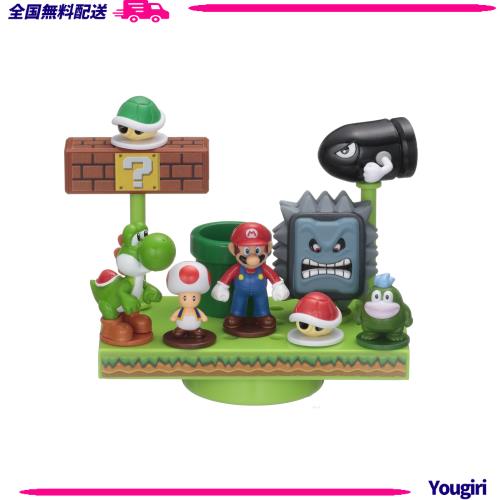 [セット内容] 彩色済み人形x8 (マリオ、ヨッシー、キノピオ、ドッスン、キラー、ガボン、アカこうら、ミドリこうら)、ステージ、土管、ブロック、ぐらぐらパーツ、柱パーツ、台座x2(キラーおよびドッスン用)、シール、取扱説明書