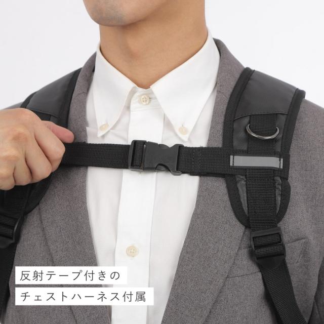 ■仕様:正面/ファスナーポケット×2、内部/オープンポケット×2、ペン差し、背面/キャリーバー通し、片側面/オープンポケット、本体内部/クッション材入りポケット、ファスナーポケット、オープンポケット×2、その他/チェストハーネス(反射テープ付)