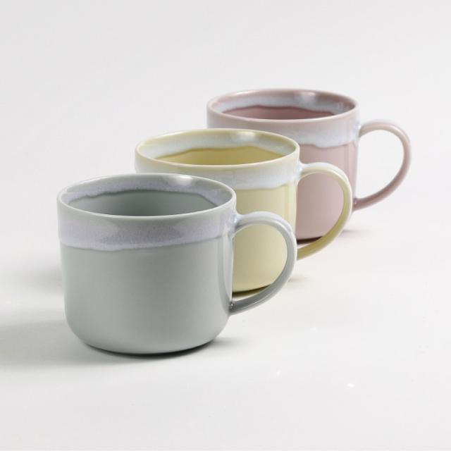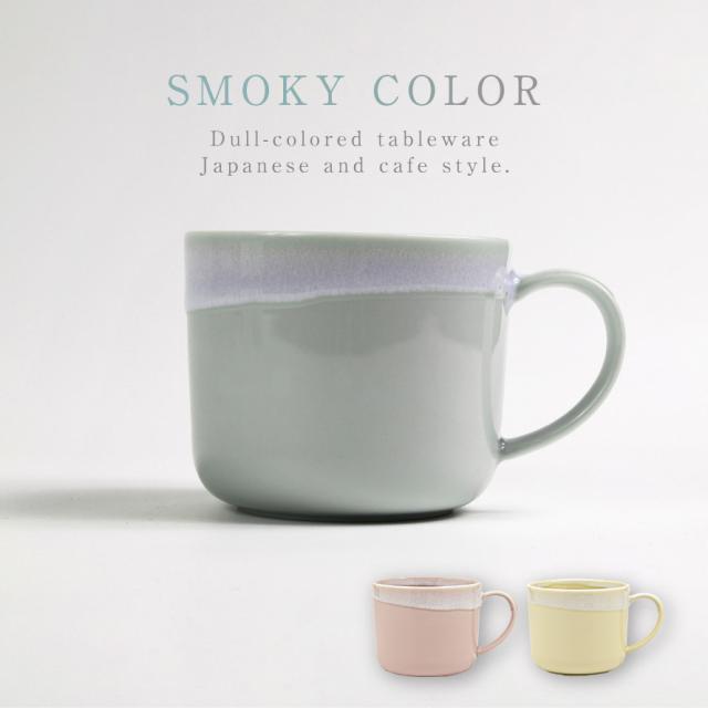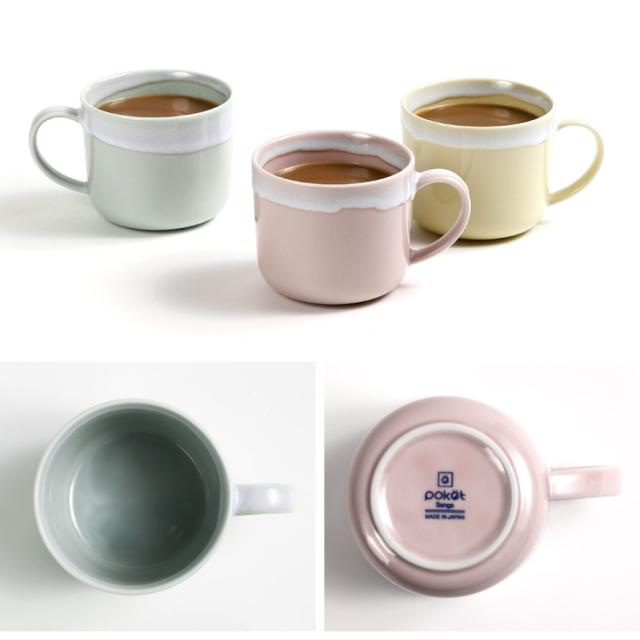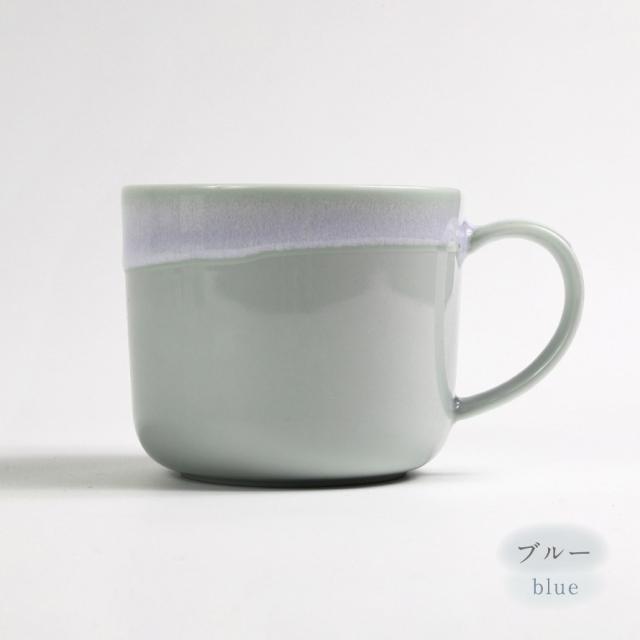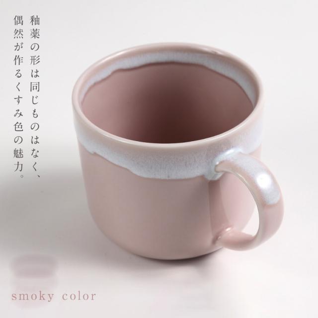 スモーキーカラーの優しい色。食卓のアクセントになる器「ポケット」。口元からかけた釉薬の形は同じものはありません。手仕事ならではの偶然が作る景色が素敵なマグカップ。