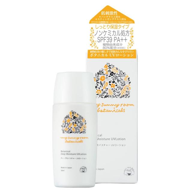 「商品情報」「主な仕様」マイサニールームボタニカルズの新生児からお使いいただけるディープモイスチャー UVローション[SPF39 PA++] 。10の無添加、植物由来成分を80%配合しており、高保湿成分としてシアオイルとビタミンE配合。肌バリア機能を高める植物由来成分でお肌を保護します。低刺激のため、敏感肌やゆらぎ肌にもおすすめ。