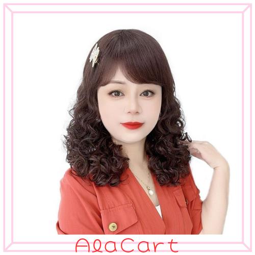 【フルウィッグ】ゆるくカールされたミディアムカールフルウィッグです。ナチュラルな小顔効果もあり、日常的な普段使いができます。初心者にも安心で簡単に着用可能です。