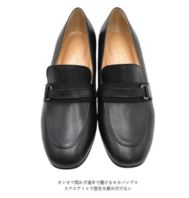マニッシュなモカスタイルをフェミニンにアレンジ。甲バンド下のグログランリボンがポイントです。サイドにあしらった小さな金具もほどよいアクセントになっています。甲を深く覆うモカデザインで脱げにくいのもポイント。指先はスクエアトゥで締め付け感も少なくなっています。