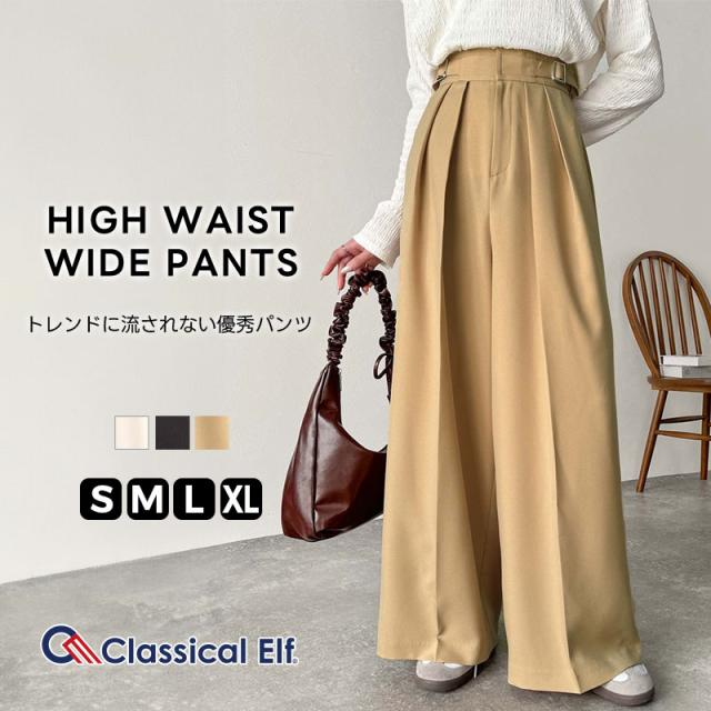 クラシカルエルフ冬新作 ボトムス パンツ レディース ハイウエスト 2タック ワイドパンツ サイドベルト オンオフ センタープレス ワイドシルエッ バックル付き 美脚見え ポリエステルツイル ロングシーズン 大きいサイズ 2025ss ce0940217