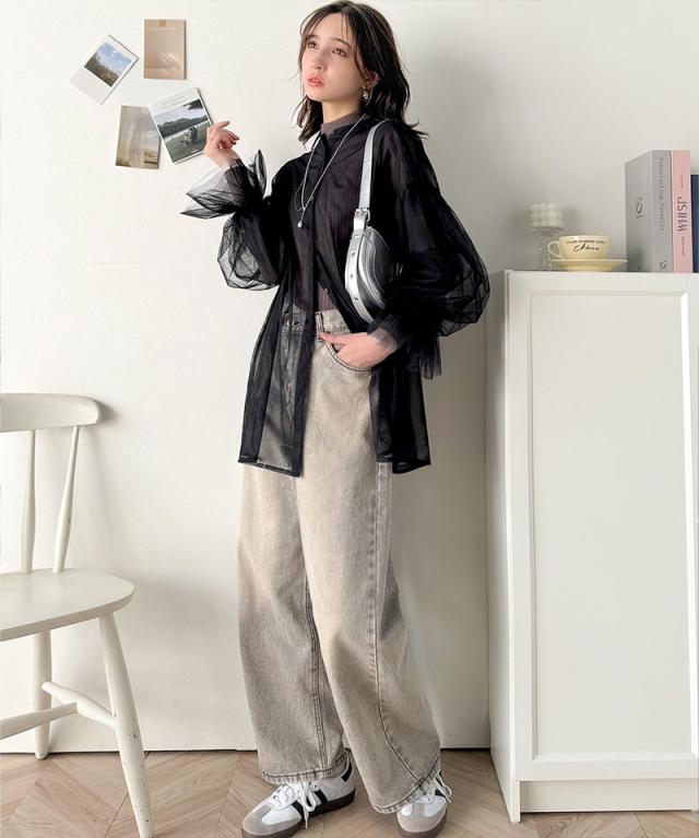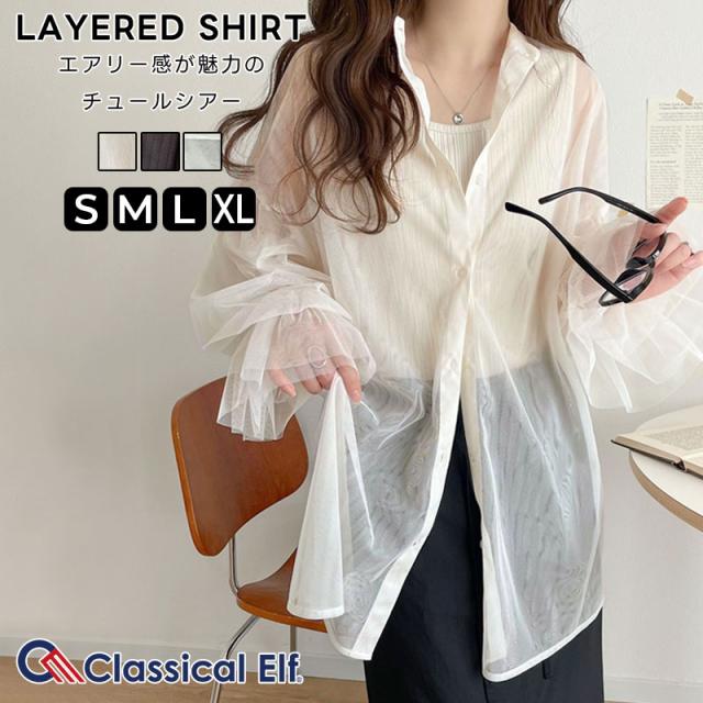 クラシカルエルフ春新作 トップス シャツ レディース シアー 素材 前後 2way フリル 袖 チュール レイヤード フリル ブラウス 長袖 ゆるっと オーバーサイズ 羽織り 大きいサイズ 2026ss ce1010372