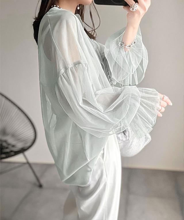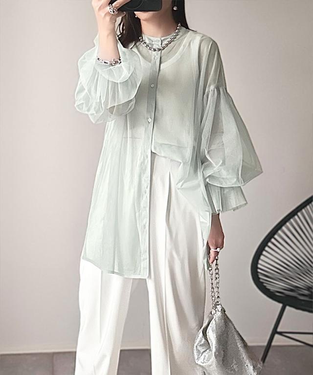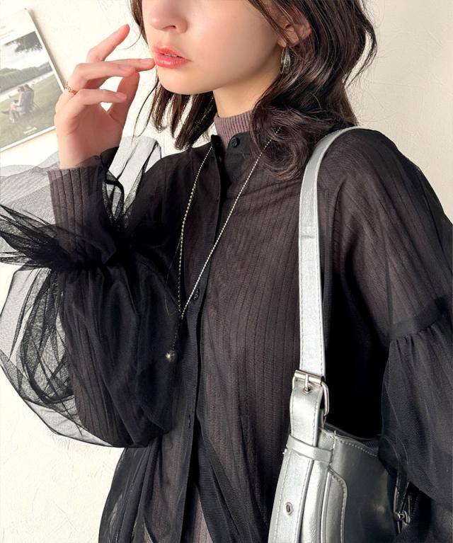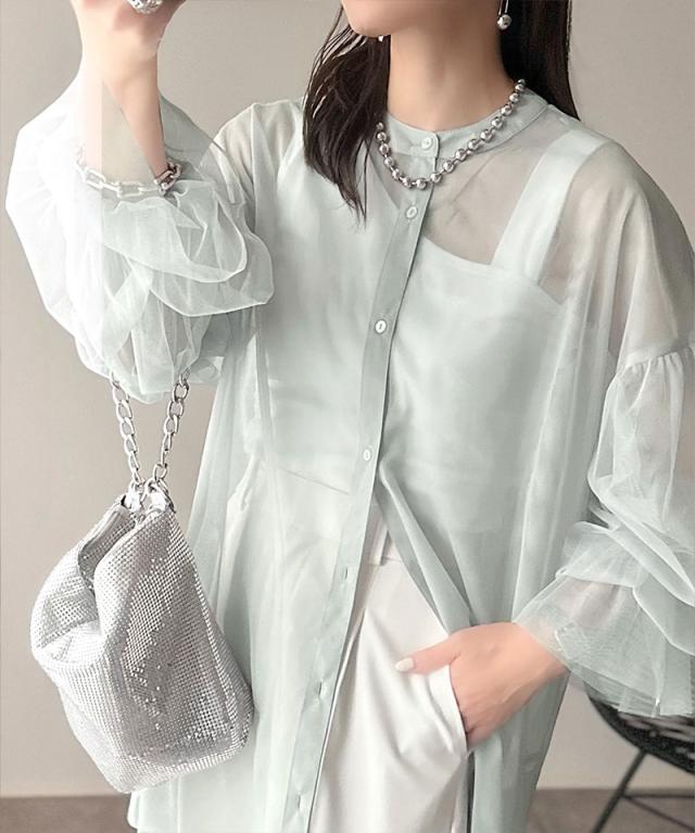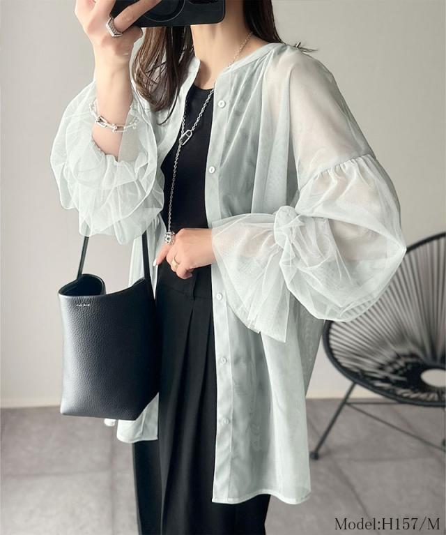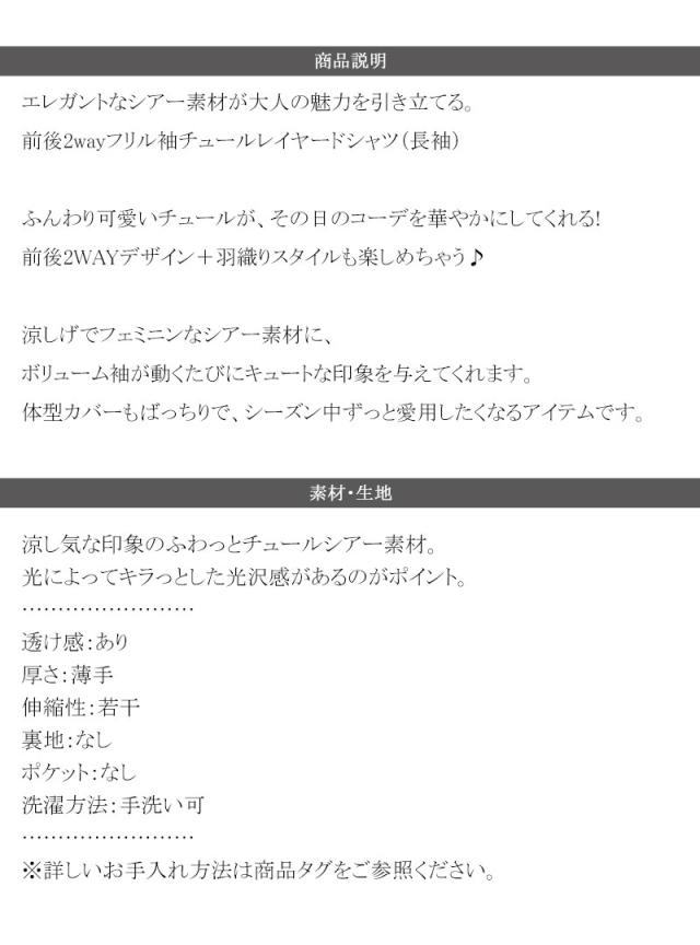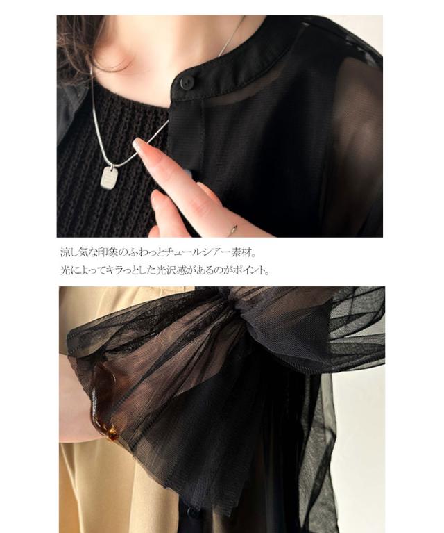 ★エレガントなシアー素材が大人の魅力を引き立てる。前後2wayフリル袖チュールレイヤードシャツ(長袖)★