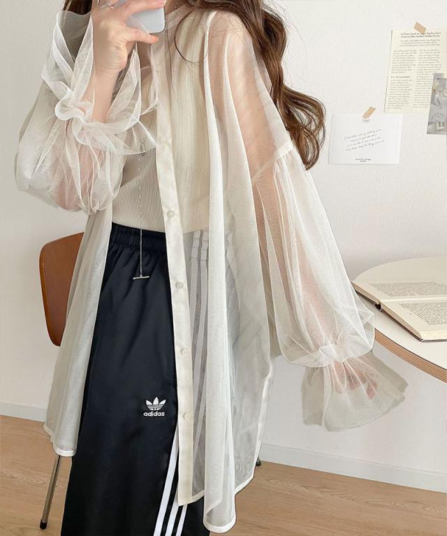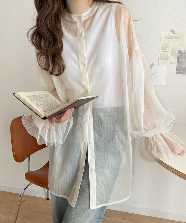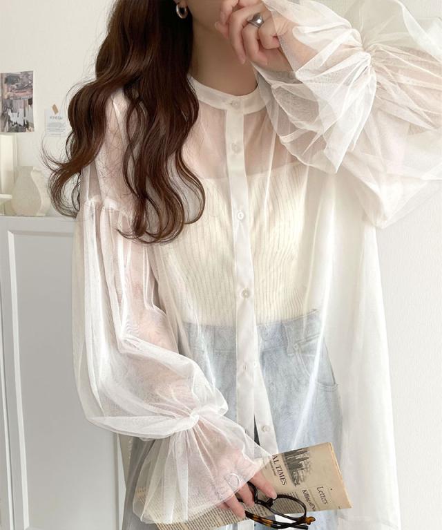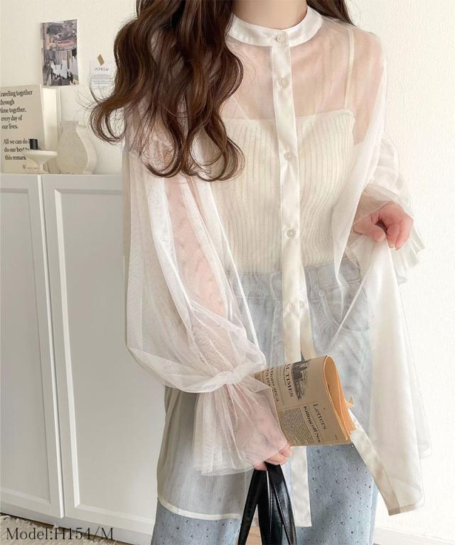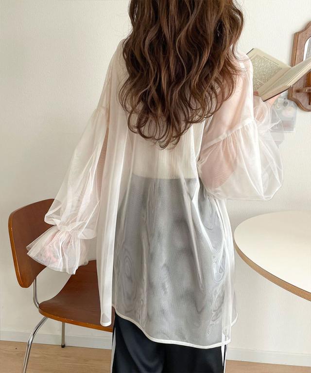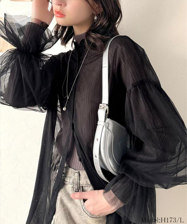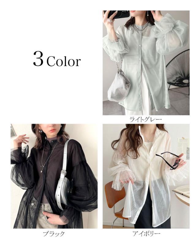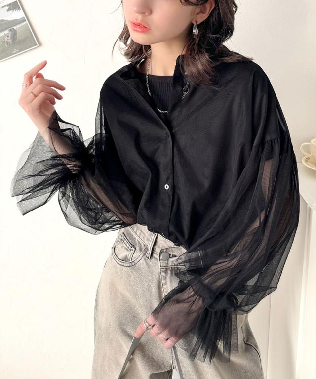 ★エレガントなシアー素材が大人の魅力を引き立てる。前後2wayフリル袖チュールレイヤードシャツ(長袖)★