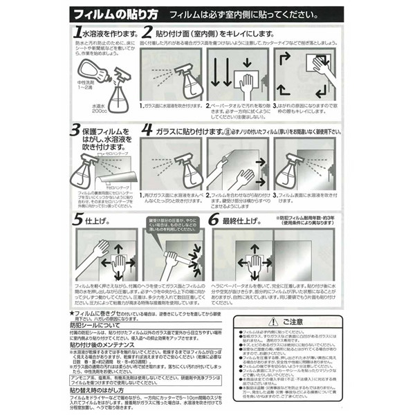 窓に張り付ける防犯フイルム。フイルム総厚206ミクロン。 クレセント錠周辺のガラスを割って侵入する犯行を防止する防犯フイルム2枚入。 ■透明ガラス専用 防犯フイルム 40x90cm 2枚入 透明 ■品番:N-2081 ■JAN:4909314110817 ※記載は商品仕様の一部です。仕様説明不足等の理由での返品はできません。特に適合等は必ずご確認ください。