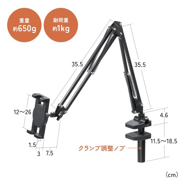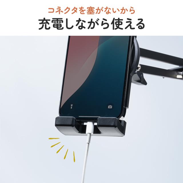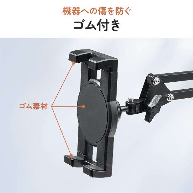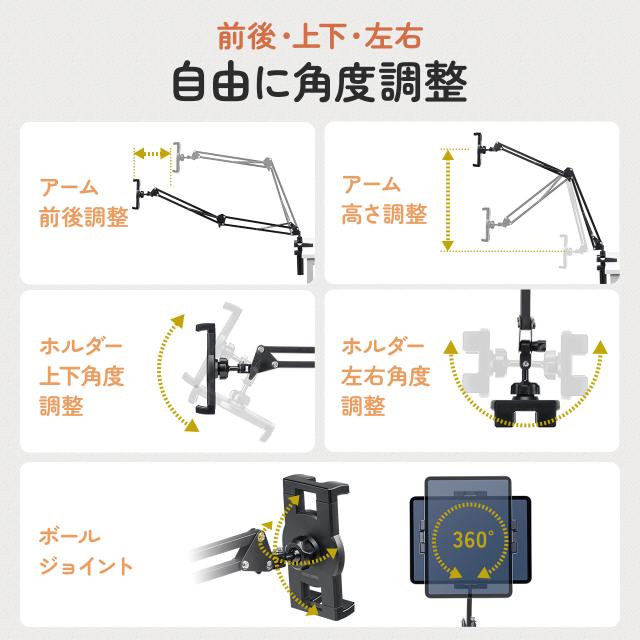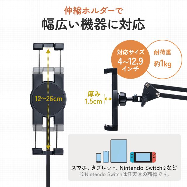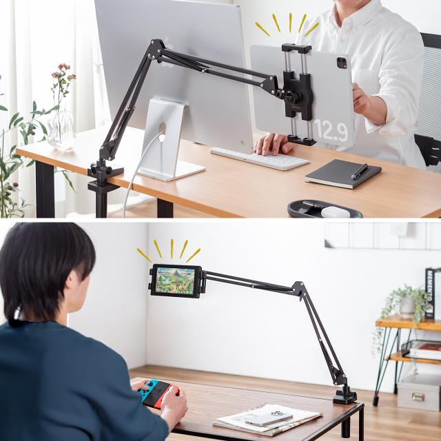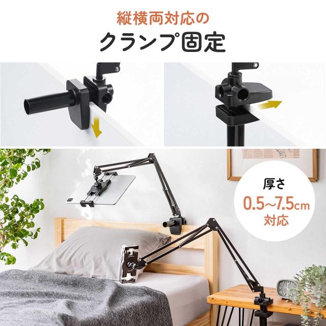 ●縦向き、横向きどちらでも取付可能なタブレット・スマートフォン用アームスタンドです。●4〜12.9インチまでに対応し、挟み込むことで固定できます。