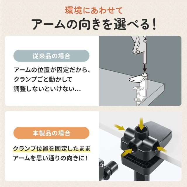 ●クランプはアームの差し込み向きを上・横等にでき、クランプ固定したままアーム向きの変更ができます。