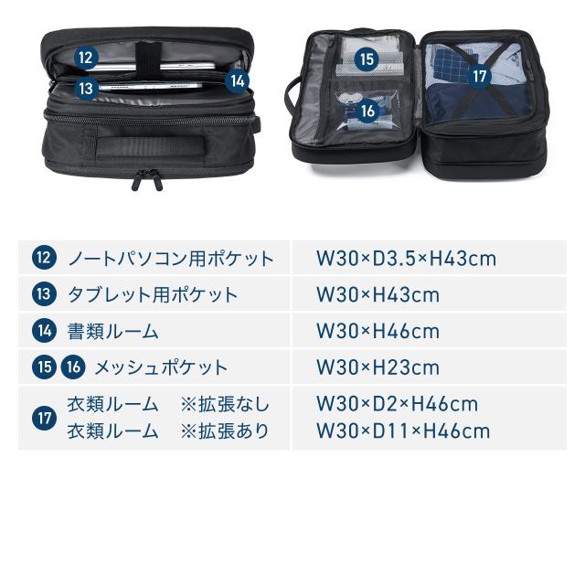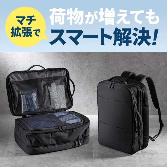 ⇒ご購入の前にご確認下さい普段はスリム、荷物が増える時にはマチ拡張で約1.5倍に大きくできるリュックサック。普段はスマートなリュックとして使い、出張や旅行ではマチを広げて2〜3泊の荷物を持ち運べる。オン・オフ使える黒1色で装飾の無いシンプルなデザインなので、ビジネスバッグや通学バッグとしても最適。メインの衣類・旅行用品ルームはスーツケースのように180度開くフルオープン式で、メッシュ素材の仕切り付き。【WEB限定商品】