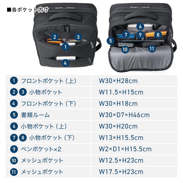 ●書類・ガジェットルームには小物用のポケットが3つ、メッシュポケットが2つ、ペンポケットが2つ、合計で7つの収納があります。