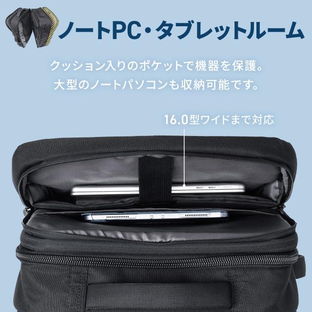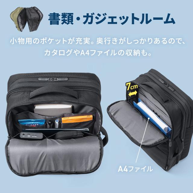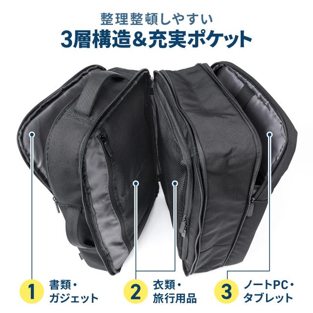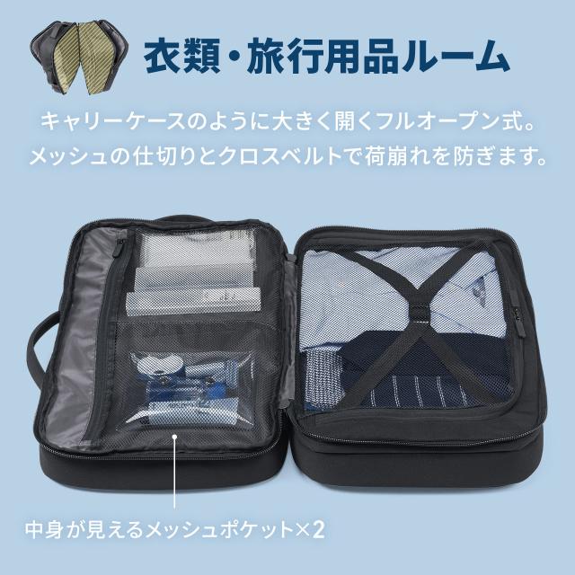 ●大きく開くメインの衣類・旅行用品ルーム、ポケットが充実の書類・ガジェットルーム、PC・タブレットルーム、があります。
