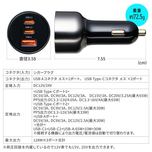 カーチャージャー PD対応 最大65W Type-C×2 USB-A×1 12V/24V車対応 PD-PPS対応 スマホ タブレット ノートパソコン Switch[200-CAR114]