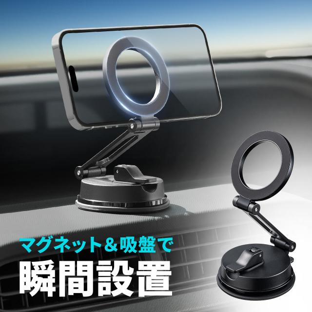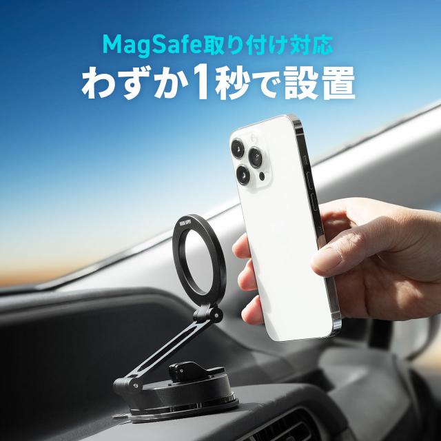 MagSafe対応車載ホルダー スマホホルダー 吸盤取り付け 超強力吸着 360度調整 片手操作 磁気吸着 折りたたみ 携帯スタンド カー用品 iPhone Android メタルリング付属[200-CAR117]
