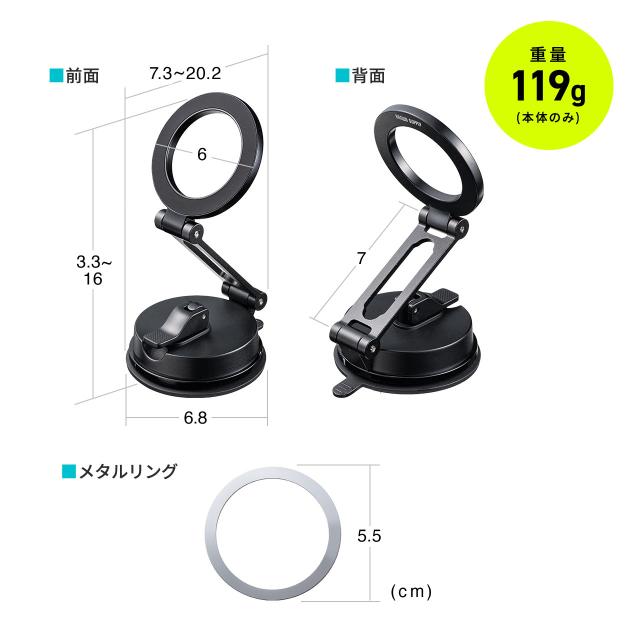 ■対応車種:吸盤部が貼り付くW6.8×D6.8cm以上の平滑で水平な場所がある車種■対応機器:MagSafe対応iPhone、または付属のメタルリングを貼り付け可能な300g以下のスマートフォン