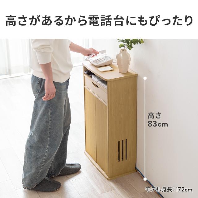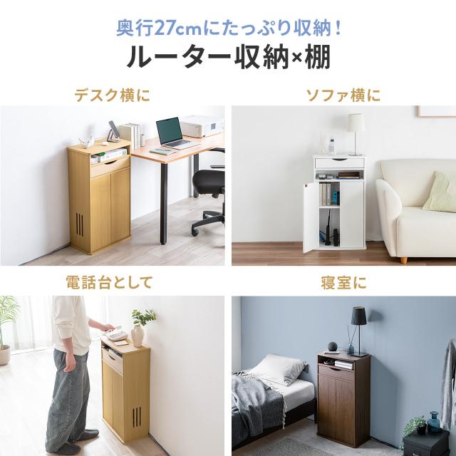 ⇒ご購入の前にご確認下さい大型ルーターやモデム、電源タップや生活雑貨が収納でき、電話台としても使用できる木製収納ラック。扉付きで見た目もスッキリ。小物の整理に便利な引き出し付き。幅48cm、奥行き27cm、高さ83cm。ダークブラウン。【WEB限定商品】