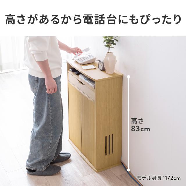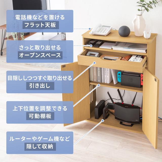 ⇒ご購入の前にご確認下さい大型ルーターやモデム、電源タップや生活雑貨が収納でき、電話台としても使用できる木製収納ラック。扉付きで見た目もスッキリ。小物の整理に便利な引き出し付き。幅60cm、奥行き27cm、高さ83cm。ダークブラウン。【WEB限定商品】