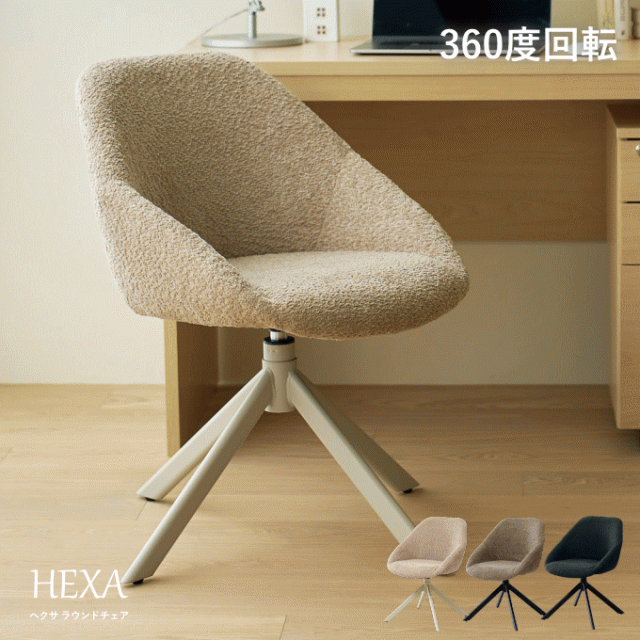 | ダイニングはもちろんデスクにも合わせられる、身体を包み込む様なフォルムの座面に、スタイリッシュな脚を合わせたモダンなデザインのチェア。カーブを描く背もたれが身体を程よくホールドします。座面が回転するラウンド機能付きで、椅子を引かなくて座れるため、狭い空間への設置も可能です。立ち座りの多いシーンにもオススメです。表面に凹凸のついたブークレ調の生地はモコモコとした肌触り。直線的でスタイリッシュな脚はスチール製。ダークグレーとダークベージュはブラック脚、ベージュはグレーホワイト脚です。 |