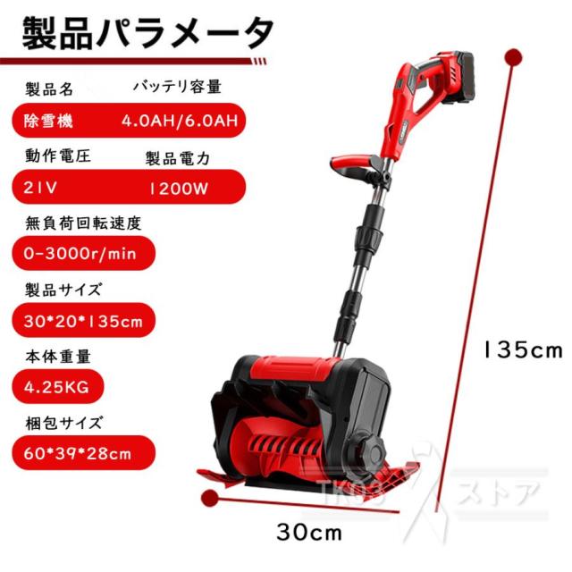 パッゲージ内容:除雪機 1台、取扱説明書(英語)X1、バッテリーX1/充電器X1