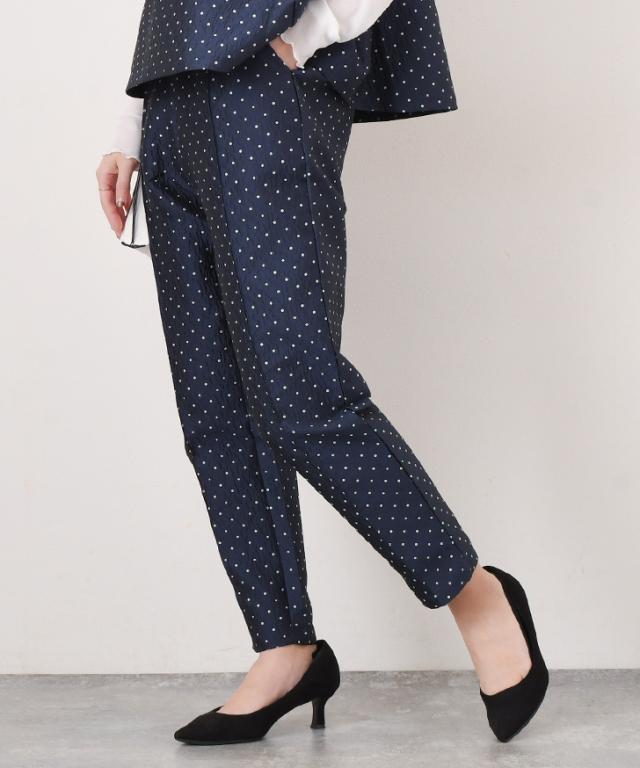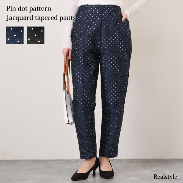 センターシームピンドット柄ジャガードテーパードパンツ レディース セットアップ ボトムスのみ 春 夏 秋 きれいめ 低身長 オフィス ウエストゴム 美脚 おしゃれ フォーマル オケージョン かわいい 上品 通勤 単品 長ズボン イージーパンツ ストレートパンツ セレモニー シンプル オフィスカジュアル お出かけ 仕事 会社 ポケット フェミニン ガーリー 下 下だけ 下のみ 細見え 足長 脚長 美ライン ゆる ラフ 衣装 k-pop ダンス 可愛い クラシカル エレガント ジャカード シンプル ベーシック 着回し 黒 ブラック ネイビー 紺色 大人 職場 通勤 通学 学生 婦人 ママ ミセス マダム 10代 20代 30代 40代 50代 在宅 テレワーク リモート 女子会 同窓会 パーティー 二次会 お呼ばれ キレカジ イベント ショッピング 買い物 野外 街着 春 夏 秋 ロングシーズン 軽量 軽い 大人可愛い 大人カジュアル アンサンブル ドット柄 水玉模様 柄物 サイドポケット ポケット付き ポケットあり センターライン センタータック 凹凸 立体感 ウェーブ