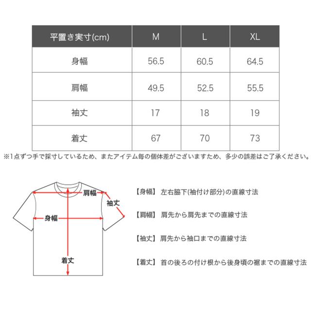 平置き実寸(cm)[身幅/肩幅/袖丈/着丈]:M:56.5/49.5/17/67・L:60.5/52.5/18/70・XL:64.5/55.5/19/73 ※多少の誤差はご了承ください