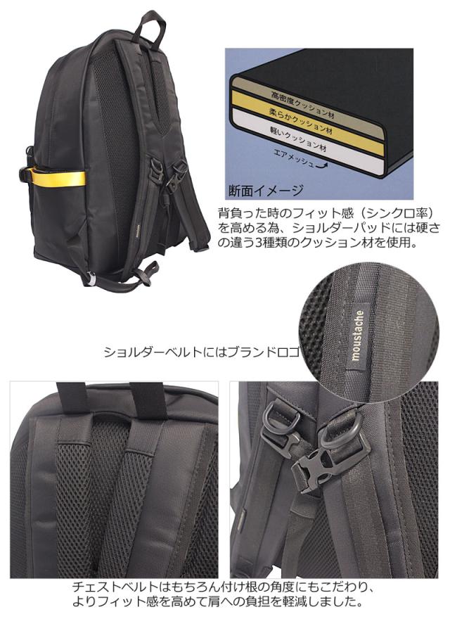 背負った時のフィット感(シンクロ率)を高める為、ショルダーパッドには硬さの違う3種類のクッション材を使用。
