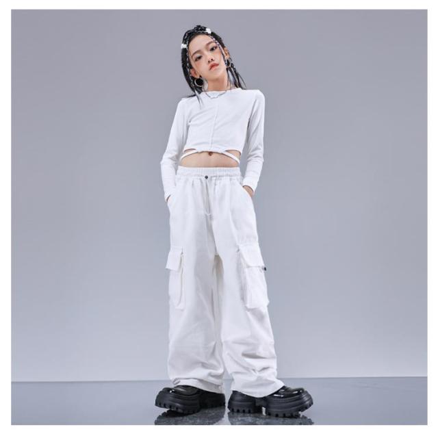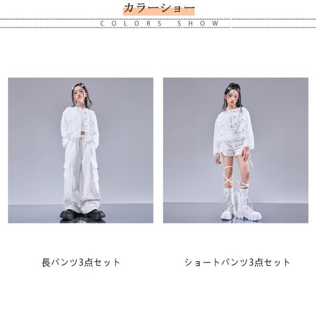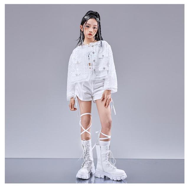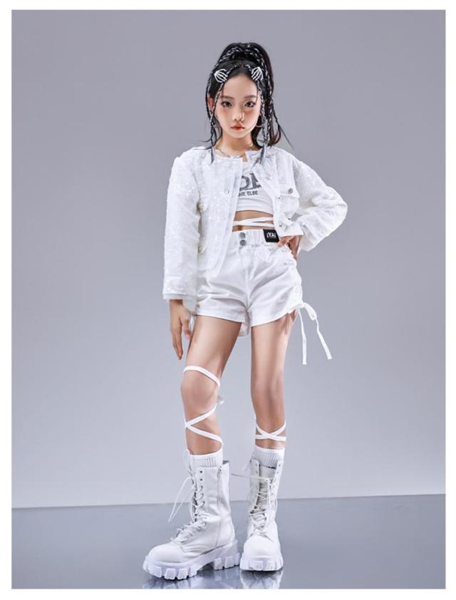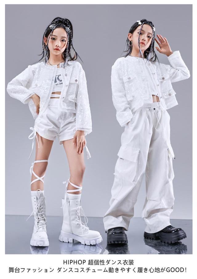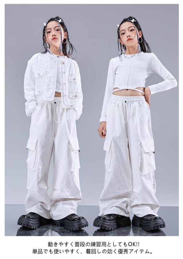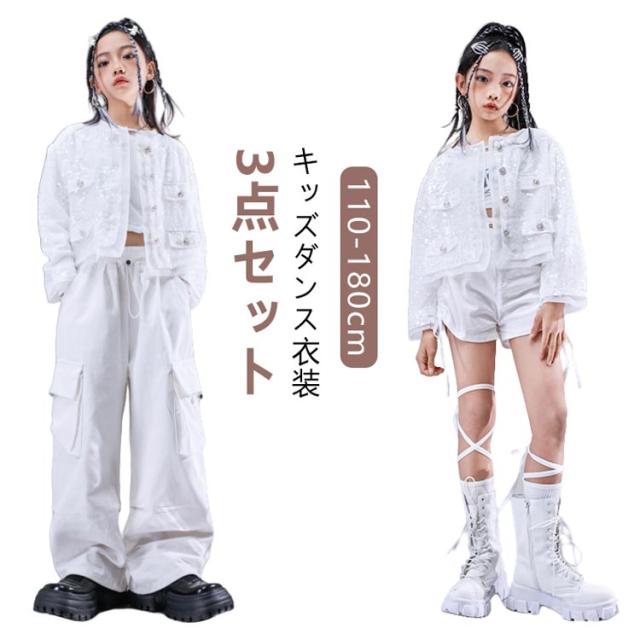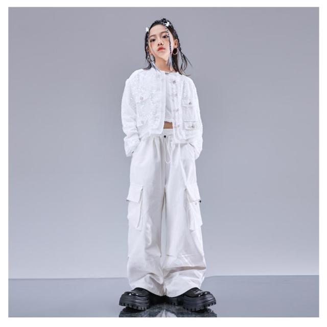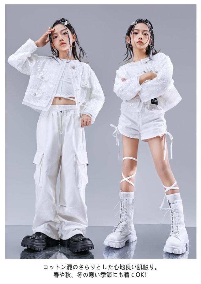 トップス キラキラ ジャケット セットアップ カッコイイ スパンコール k-pop キッズダンス衣装 衣装 k-pop へそ出し 白パンツ 女の子 アイドル 衣装 個性派 演出服 DS舞台服 応援団 ヒップホップ HIPHOP ステージ衣装 ダンスウェア 発表会 110