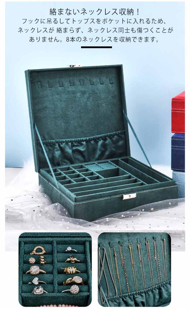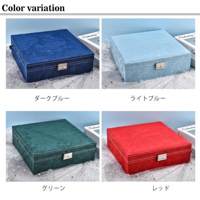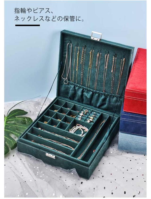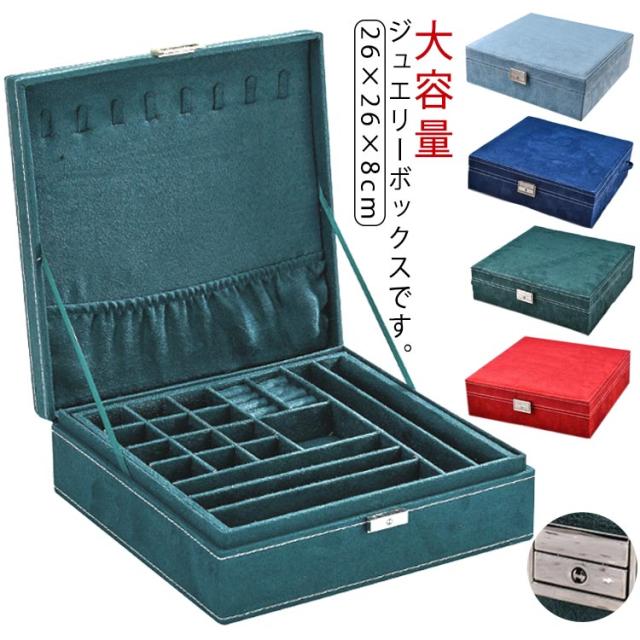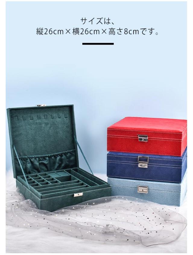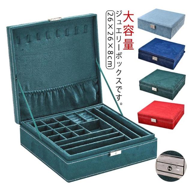 | ジュエスです。 サイズは、縦26cm×横26cm×高さ8cmです。 指輪やピアス、ネックレスなどの保管に。 2段式で大容量の収納力!アクセサリーからヘアアクセ等がまとめてキレイに収まります。仕切り板があるため、サイズや種類ごとまとめられ、整理整頓が苦手な方でもスッキリ収納できます。 鍵付きです。45度だけ回して施錠・解錠して下さい。 絡まないネックレス収納!フックに吊るしてトップスをポケットに入れるため、ネックレスが 絡まらず、ネックレス同士も傷つくことがありません。8本のネックレスを収納できます。 | |