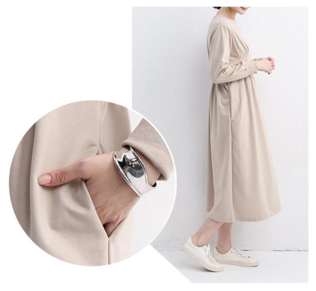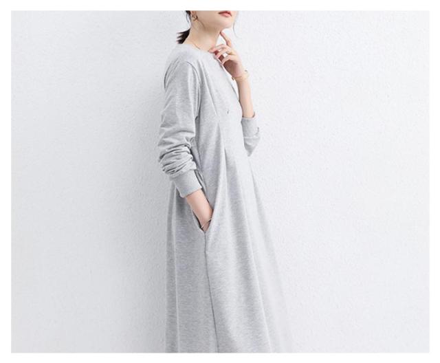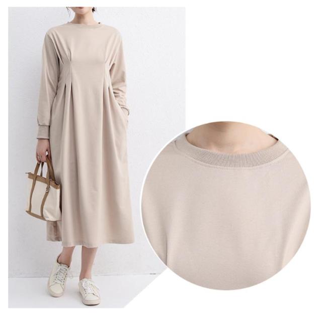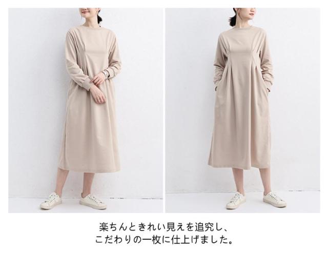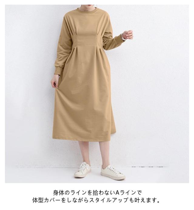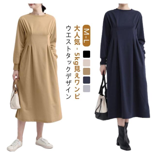春 ウエストタック ハイウエスト ロング タック 長袖 カジュアル 冬 きれいめ ロング丈 着痩せ 着痩せ 秋 大きいサイズ ラウンドネック aライン ポケット付き ロングワンピース マキシ 丈 ロングワンピ