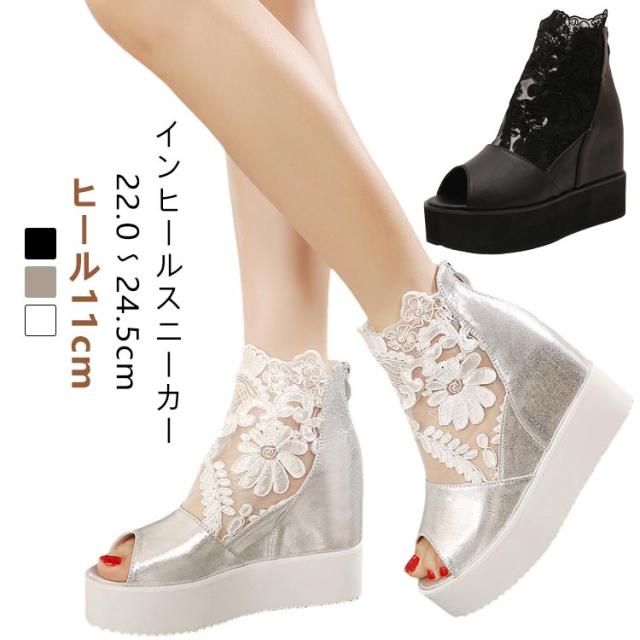 ブーツサンダル プラットフォームスニーカー シューズ ヒール ブライダルシューズ 厚底 オープントゥ 11cm スニーカー 刺繍 レース 厚底スニーカー レディース 結婚式 和装 靴 疲れない インヒール シースルー 花柄 ブラック ホワイト