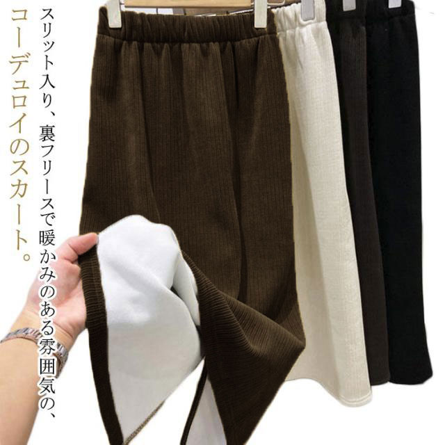 | スリット入り、裏フリースで暖かみのある雰囲気の、コーデュロイのスカート。 お洒落しながらしっかり防寒対策! ゴムで着脱ぎも楽々。 ハイウエストだからお腹回りの窮屈感がなく、INのコーデもすっきりと決まります。 普段着から通勤スタイルまで、ロングシーズン使いいただける万能ボトムス。 | |