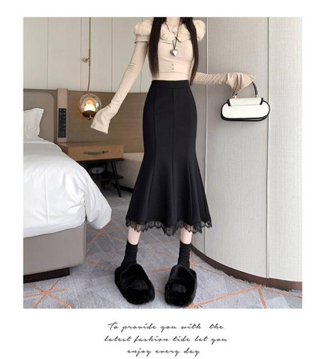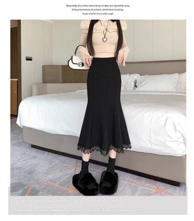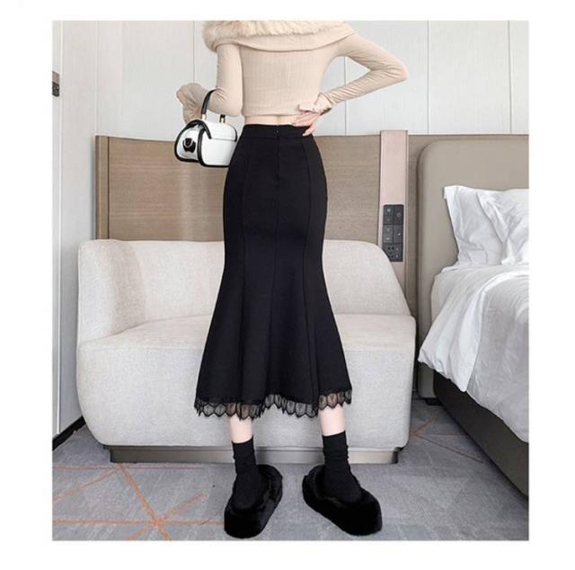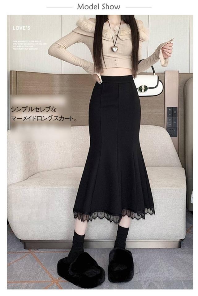 ロングスカート 秋冬 マーメイドスカート ロングスカート ミモレ丈スカート マキシスカート スカート ハイウエスト 無地 裾レース 着痩せ タイト 春 秋